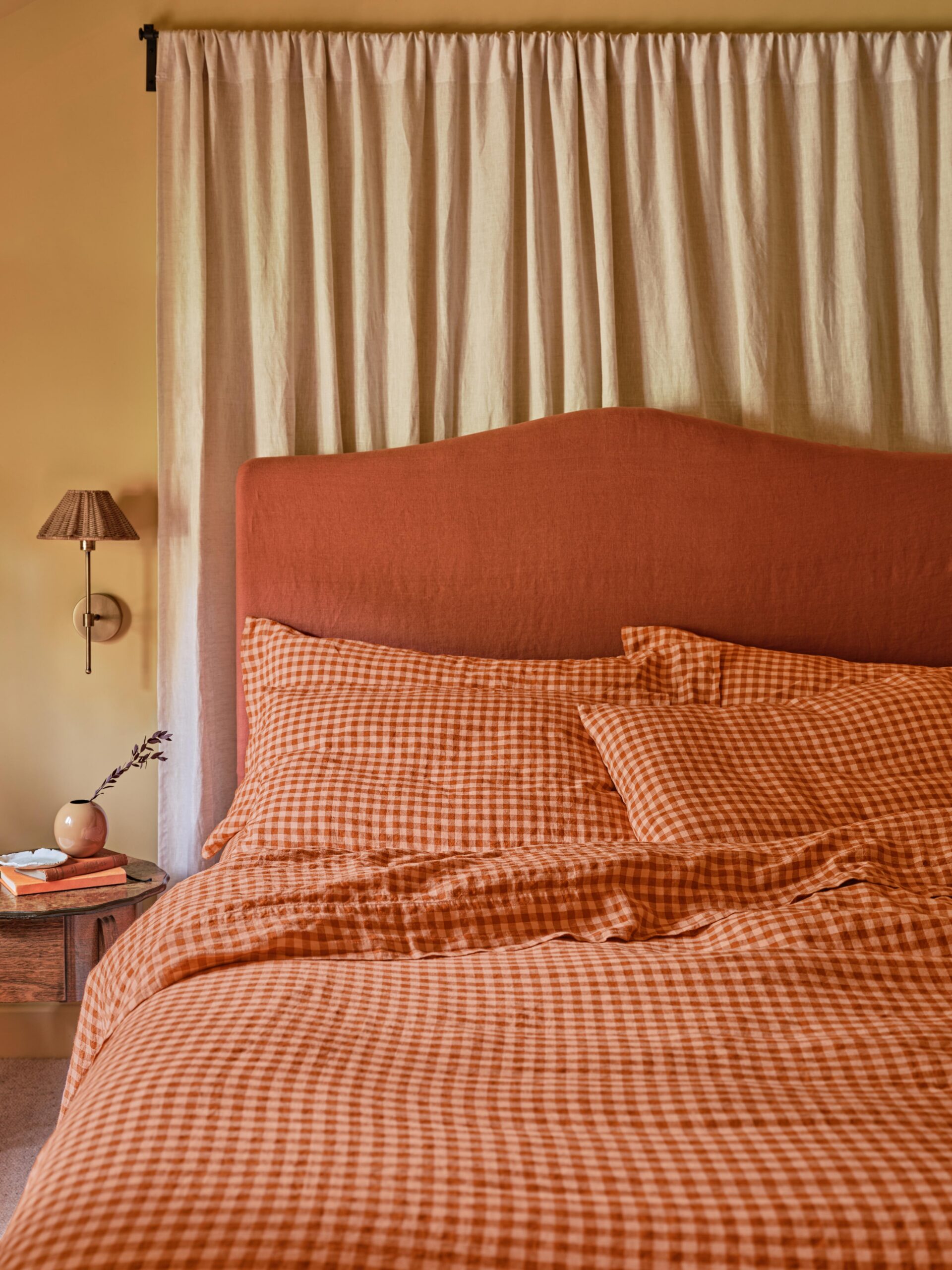 Pairing rich Cinnamon with soft Peach, our Color Drenched Gingham linen blend duvet cover serves up the perfect laid-back, layered look. Made from only the highest-quality fibers, the breathable fabric combines the effortless look of linen with the softness of cotton. Our linen blend duvet covers are finished with coconut shell button fastenings and feature handy inside corner ties to stop your duvet from slipping.Â